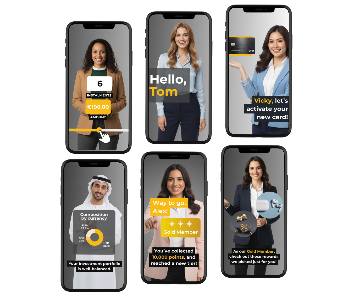 You can personalize practically everything in the video. Think of it as a programmable film. You can insert data directly into the film, such as the customer’s name or the amount of their last transaction, and create advanced logic rules that affect the content and appearance of the video.